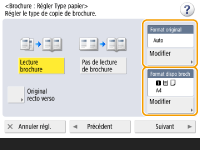 Appuyez sur <Modifier> dans <Format original> et sélectionnez la taille de l'original. Si vous sélectionnez <Auto>, le format de la brochure est automatiquement sélectionné en fonction de la taille de l'original.