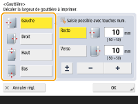 ![]() | Vous pouvez réaliser des marges pour l'agrafage et la perforation de trous. Vous pouvez spécifier les marges de reliure sur le recto ou le verso pour chaque page séparément. |