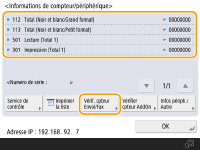 Appuyez sur <Service de contrôle> <Test de communication> pour vérifier la communication avec le serveur de surveillance à distance. Lorsque cette fonction est exécutée, les informations sur l'appareil sont périodiquement envoyées au serveur de surveillance à distance. Pour pouvoir utiliser cette fonction, vous devez activer la communication entre l'appareil et le serveur assurant le service.Vous pouvez imprimer une liste indiquant le nombre de pages utilisées pour la copie, impression, numérisation et télécopie. Vous pouvez aussi vérifier les informations des compteurs pour chaque application AddOn. Appuyez sur <Vérifier cpteur AddOn> sur l'écran à l'étape 2. Si vous appuyez sur <Infos périph./Autre> <Vérif. config. périphérique> sur le même écran, vous pouvez vérifier les équipements en option installés sur l'appareil.Pour plus d'informations sur les conditions de comptage, contactez votre revendeur ou représentant de service. |