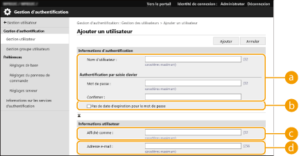Un utilisateur avec «Administrator» comme nom d'utilisateur est mémorisé par défaut en tant qu'utilisateur avec des privilèges d'administrateur. Cet utilisateur «Administrator» ne peut pas être supprimé, mais il peut être désactivé après avoir ajouté un autre utilisateur avec les privilèges «Administrator». Si l'utilisateur «Administrator» est désactivé, vous ne pouvez pas changer les réglages que seul l'utilisateur «Administrator» peut configurer, sur le panneau de commande de la machine.