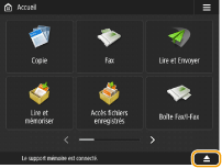 Si l'option <Choisir options lors de la connexion support mémoire> est défini sur <Oui>, les raccourcis pour les fonctions disponibles s'affichent lorsque vous insérez des supports de mémoire. <Choisir options lors de la connexion support mémoire> ![]() Comme les raccourcis peuvent ne pas s'afficher si l'appareil est en mode Veille, insérez les supports de mémoire une fois que la machine n'est plus en mode Veille. |