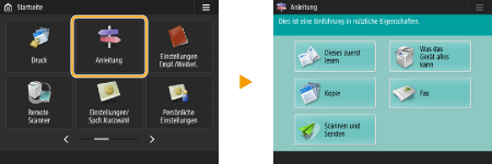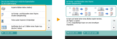 Funktionsführung anzeigenDrücken Sie <Anleitung>, um einen Bildschirm mit Erläuterungen zu den Funktionen des Geräts sowie Tipps zur Verwendung von Kopieren, Scannen usw. anzuzeigen. Schauen Sie sich diesen Bildschirm an, wenn Sie mehr über die verfügbaren Funktionen und ihre Verwendung erfahren möchten. Beispiel: Anleitung für Kopierfunktionen Wenn Sie ein Element in der Liste auswählen, wird der Anleitungsbildschirm angezeigt. Hilfefunktion verwendenJe nach angezeigter Funktion erscheint manchmal  oben rechts auf dem Bildschirm. Drücken Sie  , um eine Erläuterung zu der Funktion und dem Funktionsverfahren zu lesen. Drücken Sie <Kommunikation beenden>, um zum vorherigen Bildschirm zurückzukehren. Gehen Sie genauso wie bei einem Smartphone vor (streichen/ziehen und ablegen)In einigen Bildschirmen ist es möglich, die Seiten durch Streifen mit dem Finger über den Bildschirm nach oben oder nach unten bzw. nach links oder nach rechts umzublättern oder zu scrollen, und zwar so wie Sie es bei einem Smartphone machen würden. Streichen sowie Ziehen und Ablegen können nicht verwendet werden, wenn <Bildschirmfarben umkehren> auf <Ein> gesetzt ist. <Bildschirmfarben umkehren>Auf Bildschirmen mit beweglichen Tasten können diese durch Halten und Ziehen verschoben werden. |