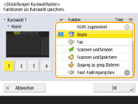 Wählen Sie die Funktion aus der Liste. Sie können die Position der ausgewählten Schnellschaltfläche und die ihr zugewiesene Funktion im Vorschaubildschirm auf der linken Seite der Liste überprüfen.