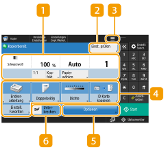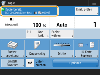 Zeigt den Einstellungsstatus, wie zum Beispiel Kopierfaktor, Papierformat und Anzahl der Kopien, an. Achten Sie darauf, die Einstellungen zu prüfen, um ordnungsgemäß kopieren zu können. Drücken Sie zur Änderung der Einstellung die Schaltfläche unterhalb des Anzeigebereichs.