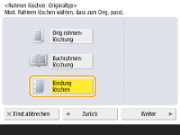 1 | Drücken Sie <Buchrahmen löschung>, und überprüfen Sie <Originalformat>. ![]() Wenn das unter <Originalformat> angezeigte Format sich vom festgelegten Buchformat unterscheidet, drücken Sie <Ändern>, um das Format auszuwählen. |