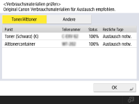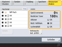 Sie können die verbleibende Menge an Verbrauchsmaterialien über die Remote UI prüfen. Überprüfen des Gerätestatus |