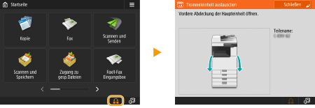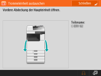 Näheres zu der Modellnummer der Trommeleinheit finden Sie unter Ersatzteile. Die am unteren Rand des Bildschirms erscheinende Meldung zum Ersetzen der Trommeleinheit hängt von Ihrem Vertrag ab. Drücken Sie <Schließen>, nachdem Sie die Trommeleinheit ausgewechselt haben. |