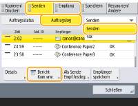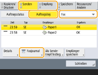 Wenn Sie  (Statusmonitor) drücken, erscheint der Bildschirm „Statusmonitor“, auf dem Sie den Nutzungsverlauf der jeweiligen Funktion wie beispielsweise Kopieren, Drucken, Senden von E-Mails, Senden/Empfangen von Faxen/I-Faxen usw. überprüfen können. Über diesen Bildschirm können Sie zudem den Nutzungsverlauf der jeweiligen Funktion ausdrucken.