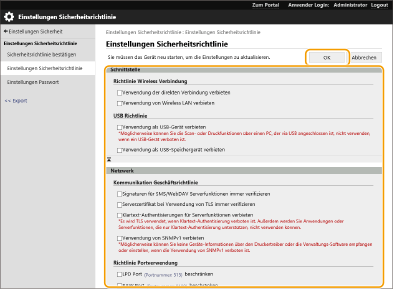 Die Geräteeinstellungen in Bezug auf die Informationssicherheit können angewendet und stapelweise verwaltet werden. Es wird empfohlen, dass der Administrator für Informationssicherheit, der mit der Verwaltung Ihrer Sicherheitsrichtlinien beauftragt ist, die Sicherheitsrichtlinien am Gerät in Übereinstimmung mit den Richtlinien Ihres Unternehmens anwendet. Melden Sie sich bei Remote UI mit den Adminstratorrechten an, um die Sicherheitsrichtlinien zu konfigurieren.