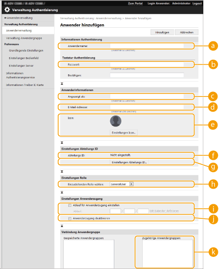 dc | Nein | 0 bis 32 Zeichen | Kontrollzeichen | - (N/A) | Kann nicht geändert werden. Wird den folgenden Benutzern automatisch zugewiesen. Nach Server-Authentifizierung registrierte Benutzer |