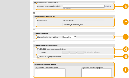 [Verbindung Anwendergruppe]Wenn Sie den Benutzer einer Gruppe zuweisen möchten, wählen Sie eine registrierte Benutzergruppe aus der Liste aus, und klicken Sie auf [Hinzufügen]. Diese Einstellung wird nicht angezeigt, wenn Sie Abteilungs-IDs als Benutzergruppen verwenden.