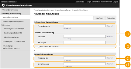 Ein Benutzer mit dem Anwendernamen „Administrator“ ist standardmäßig als Benutzer mit Administratorrechen registriert. Dieser „Administrator“-Benutzer kann nicht gelöscht werden, aber er kann nach dem Hinzufügen eines anderen Benutzers mit „Administrator“-Rechten deaktiviert werden. Wenn der „Administrator“-Benutzer deaktiviert ist, können Sie keine Einstellungen ändern, die nur der „Administrator“-Benutzer auf dem Bedienfeld des Geräts konfigurieren kann.