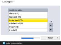 Legen Sie Ihr Land/Ihre Region fest. ![]() ![]() Wählen Sie Ihr Land/Ihre Region und drücken Sie <OK>. | |