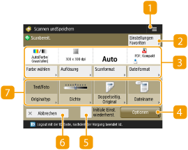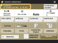 Wenn Sie <Scannen und Speichern> auf dem Bildschirm <Startseite> drücken und dann <Netzwerk> oder <Speichermedium> zum Scannen der Originale drücken, wird der folgende Einstellungsbildschirm angezeigt.