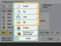 ![]() | È possibile registrare il numero di fax di un destinatario o un indirizzo e-mail da utilizzare quando si inviano i documenti digitalizzati nella Rubrica. Inoltre, è possibile registrare una destinazione I-fax, la posizione di una cartella file server (indirizzo IP e percorso) e l'archivio (Area di condivisione) di una stampante multifunzione Canon nella Rubrica come destinazione. |