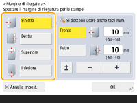 ![]() | È possibile creare dei margini di rilegatura per applicare punti o praticare fori. È possibile impostare i margini di rilegatura singolarmente sulla fronte e sul retro delle pagine. |