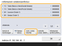 Premere <Servizio di monitoraggio> <Test di comunicazione> per verificare la comunicazione con il server di monitoraggio remoto. Quando viene eseguita questa funzione, le informazioni sulla macchina vengono inviate periodicamente al server di monitoraggio remoto. Per poter utilizzare questa funzione è necessario abilitare la comunicazione tra la macchina e il server che fornisce il servizio.È possibile stampare un elenco che mostra il numero di pagine usate per la copia, la stampa, la scansione e i fax. È possibile verificare anche le informazioni contatore per ogni applicazione AddOn. Premere <Controllo contat. AddOn> nella schermata del passaggio 2. Se si preme <Informazioni periferica/Altro> <Contr. config. periferica> nella stessa schermata, è possibile verificare le opzioni installate nella macchina.Per informazioni sulle condizioni di conteggio, contattare il rivenditore o il rappresentante di servizio. |