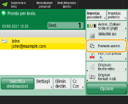 Per verificare il numero totale di destinazioni specificateIl numero totale di destinazioni specificate viene visualizzato in alto a destra della schermata. Ciò consente di verificare che il numero di destinazioni sia corretto prima dell'invio. ![]() Per annullare immediatamente un lavoro in corso di invioSe si preme (Stop) sul pannello di controllo durante l'invio di un lavoro, viene visualizzato il messaggio <Si vuole annullare il seguente lavoro di invio?>. Premere <Sì> per annullare l’invio.È possibile selezionare <Ultimo lavoro ricevuto> o <Lavoro in corso di invio> per scegliere il lavoro da annullare. <Lavoro da annullare alla pressione di Stop> Premere (Stop) in presenza di più lavori di invio per visualizzare la schermata di selezione del lavoro di invio da annullare. Se il lavoro di invio da annullare non è visualizzato, premere <Controllo altri lavori> per visualizzare <Lavori invio>. Selezionare il lavoro da annullare e premere <Annulla>.Per controllare gli stati dei documenti inviati e salvatiNella schermata <Monitor. stato>, è possibile verificare gli stati dei documenti inviati/salvati. Questa schermata consente di inviare/salvare nuovamente i documenti oppure di annullare l'invio/salvataggio dopo la verifica degli stati. Controllo di stato e registro per i documenti sottoposti a scansione Se <Visualizzazione notifica ad accettazione lavoro> è impostato su <On>, la schermata <Monitor. stato> potrebbe essere visualizzata dalla seguente schermata, visualizzata dopo la ricezione di un lavoro inviato. <Visualizzazione notifica ad accettazione lavoro> ![]() Per stampare il rapporto dei risultati di invio/salvataggioNella schermata delle funzioni di base per la scansione, se si preme <Opzioni> <Rapporto risultato TX> è possibile impostare la stampa automatica del rapporto che elenca i risultati dell'invio/salvataggio.Per impostare per ogni lavoro da <Opzioni>, è necessario selezionare <Solo se errore> o <Off> in <Rapporto risultato TX>, quindi impostare <Consentire stampa da Opzioni> su <On>. Nome fileQuando si invia/salva un file, il nome file viene automaticamente impostato in base al seguente formato. È possibile cambiare l'impostazione in modo da poter assegnare un altro nome. Impostazione di un nome di file Quando si invia per e-mail il formato "Numeri lavoro (quattro cifre)_numeri pagina (tre cifre).nome estensione file", ad esempio "1042_001.jpg" Quando si salva in un file server il formato "Anno, mese, giorno, ora, minuti e secondi di salvataggio del file (14 cifre).nome estensione file", ad esempio "20151030133541.jpg" Oggetto e-mailL'oggetto inserito in <Oggetto predefinito> viene impostato automaticamente (<Oggetto predefinito>). Se si specifica un oggetto diverso, modificare le impostazioni oppure specificare l'opzione ogni volta che si spedisce un'e-mail (Specifica delle impostazioni e-mail). |