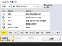 ![]() | Puede registrar el número de fax del destinatario o una dirección de correo electrónico que se puede utilizar al enviar documentos escaneados de la Libreta de direcciones. Además, puede registrar un destino de l-fax, la ubicación de una carpeta de un servidor de archivos (dirección IP y ruta) y el almacenamiento (Espacio avanzado) de una impresora multifunción Canon en la Libreta de direcciones como un destino. |