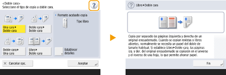 Ver la guía de funcionesPulse <Ayuda> para ver una pantalla que explica lo que puede hacer con las funciones del equipo, así como consejos de uso de la copiadora, el escáner, etc. Puede ver esta pantalla cuando desee saber más sobre las funciones disponibles y cómo utilizarlas. Ejemplo: Ayuda para funciones de copia Al seleccionar un elemento de la lista, aparece la pantalla del tutorial. Utilizar la función de ayudaSegún la función que se muestra, a veces aparece  en la parte superior derecha de la pantalla. Pulse  para consultar la descripción y el método de funcionamiento de la función. Pulse <Finalizar comunicación> para volver a la pantalla anterior. Utilizar del mismo modo que con un smartphone (desplazar/arrastrar y soltar)En algunas pantallas puede cambiar de página o deslizarse desplazando el dedo arriba/abajo o a izquierda/derecha sobre la pantalla como lo haría con un smartphone. Las operaciones de deslizar el dedo y de arrastrar y soltar no se pueden usar cuando <Invertir colores de pantalla> está configurado como <Sí>. <Invertir colores de pantalla>En las pantallas con botones móviles, estos pueden arrastrarse y soltarse para moverlos. |
