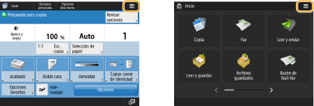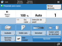 Pulse , que aparece en la pantalla <Inicio> y en la pantalla Funciones básicas, para personalizar la pantalla, reorganizando botones o creando una tecla de acceso directo. Personalizar la pantalla táctil![]() Puede cambiar las opciones de visualización en pantalla, como por ejemplo la pantalla que aparece justo después de encender el equipo, y si aparece el mensaje de papel y tóner restantes. <Opciones de visualización> Puede establecer qué pantalla debe mostrarse cuando haya transcurrido un tiempo sin que se realice ninguna operación. <Función tras reinicio automático> |