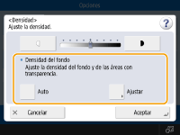 ![]() | Se puede ajustar la densidad del fondo. Eso permite realizar copias claras de originales como periódicos u originales con fondo de color. Ajustar la densidad del fondo de las copias |