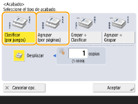 Si pulsa <Opciones>  <Formar trabajo> en la pantalla de funciones básicas de copia, podrá utilizar la función Clasificar/Agrupar aunque el original esté colocado en el cristal de copia.