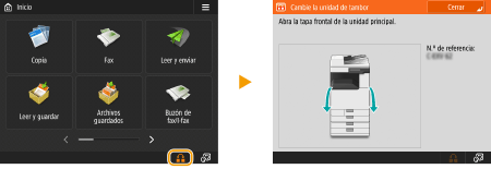 Cuando la unidad de tambor se acerca al final de su vida útil, aparecerá un mensaje indicándole que sustituya la unidad de tambor en la parte inferior de la pantalla. Pulse el icono en la parte inferior derecha de la pantalla, y siga las instrucciones en pantalla para sustituir la unidad de tambor.