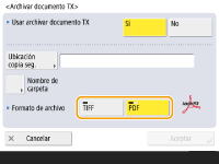 No puede realizar un Envío directo si establece <Archivar documento TX> en <Sí> Esta opción cambia automáticamente a <No> en los siguientes casos. Especifique el destino de nuevo o vuelva a poner la opción en <Sí> según corresponda. Cuando el destino de la copia de seguridad se ha eliminado de la libreta de direcciones Cuando se ha importado una libreta de direcciones desde la IU remota Importar/exportar datos de configuración Cuando se ha recibido una libreta de direcciones desde el software de administración de libretas de direcciones <Importar/Exportar desde software gestión libr. direcc,> |