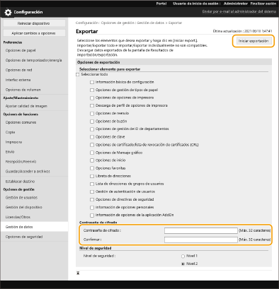 seleccione el nivel de seguridad en [Nivel de seguridad] haga clic en [Iniciar exportación]