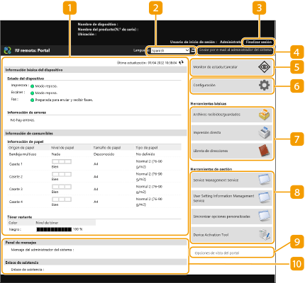 La página de portal que se muestra a continuación aparece al iniciar una sesión en la IU remota. En esta sección se describen los elementos que aparecen en la página de portal y las operaciones básicas.