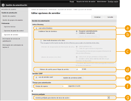 4 | Introduzca la información necesaria. ![]() [Nombre de dominio:]Introduzca el nombre de dominio del Active Directory que es el destino de inicio de sesión (Ejemplo: empresa.dominio.com). [Nombre de NetBIOS]Introduzca el nombre de dominio de NetBIOS (Ejemplo: empresa). [Nombre de host primario:] / [Nombre de host secundario]Introduzca el nombre de host del servidor Active Directory (Ejemplo: ad-server1). Si utiliza un servidor secundario, especifique el nombre en [Nombre de host secundario]. [Nombre de usuario:] / [Contraseña:]Introduzca el nombre de usuario y la contraseña para acceder al servidor Active Directory y buscar. [Nombre de inicio sesión:] / [Aparece como] / [Dirección de e-mail]Especifique los campos de datos (nombres de atributo) del nombre de inicio de sesión, el nombre visualizado y la dirección de correo electrónico de cada cuenta de usuario en el servidor Active Directory (Ejemplo: sAMNombreCuenta, cn, mail). |