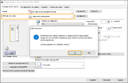 ![]() | Puede establecer una hora para iniciar la impresión, que resultará útil al imprimir grandes cantidades de documentos por la noche, etc. |