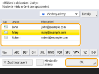 Místo určení pro vyrozumívací e-mail je třeba zadat z adresáře. Uložte požadované místo určení předem. Uložení míst určení do adresáře