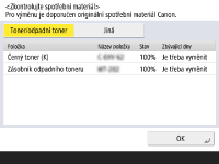 I když je v okně <Zbývající dny> zobrazeno upozornění <Je třeba vyměnit>, neprovádějte výměnu, dokud se v oblasti zobrazení stavu nezobrazí zpráva vyzývající k výměně spotřebního materiálu (ve spodní části displeje dotekového panelu).