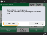 Je-li možnost <Zobrazit oznámení při akceptování úlohy> nastavena na <Ano>, lze z obrazovky zobrazené po přijetí úlohy odesílání zobrazit obrazovku <Monitor stavu>. <Zobrazit oznámení při akceptování úlohy>