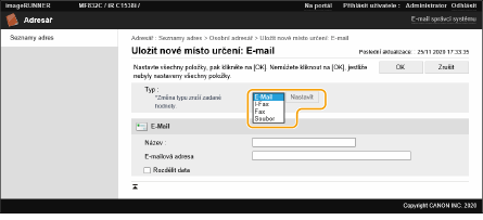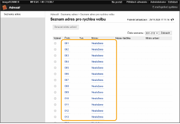 [Address List for Administrators] je k dispozici pouze správcům, kteří se do systému přihlásí s přístupovými právy správce (Administrator) nebo s právy správce zařízení (DeviceAdmin).