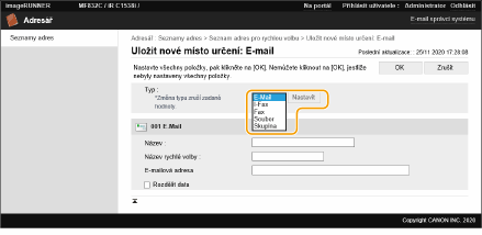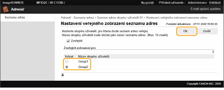 Spravovat seznamy adres uživatelských skupin povolením lze také tak, že povolíte pouze uživatelům s právy administrátora (správce), aby mohli ukládat/upravovat místa určení přes Remote UI (Vzdálené UR). <Použít skupinový adresář uživatelů>