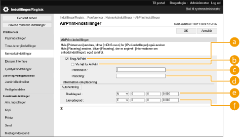 Hvis du logger på med administratorrettigheder, kan du også ændre AirPrint-indstillingerne fra siden for AirPrint.