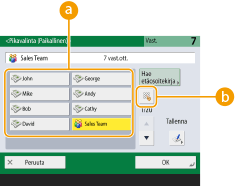 Osoitekirjan voi mukauttaa kullekin sisäänkirjautuneelle käyttäjälle (Mukautettavien kohtien luettelo). Lisäksi Synkronoi muokatut asetukset -toiminnon avulla osoitekirja voidaan jakaa usean Canon-monitoimitulostimen kanssa (Useiden Canon-monitoimitulostinten asetusten synkronoiminen).