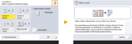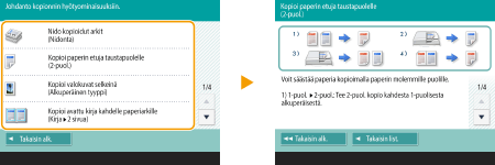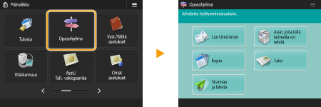 Näytä toiminto-opas<Opasohjelma> avaa näytön, jossa esitellään laitteen toimintoja sekä kerrotaan vinkkejä kopiointiin, skannauksen yms. Avaa tämä näyttö, kun haluat saada lisätietoja toimintojen käytettävyydestä ja niiden käyttämisestä.