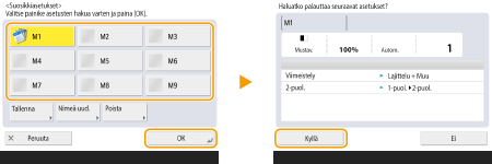 Kopiointi/skannaus- ja lähetystoiminnoille voi myös määrittää, että laite ei näytä vahvistusnäyttöä, kun tallennetut asetukset haetaan.