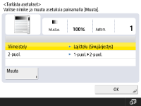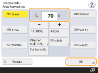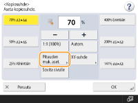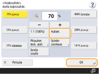 Jos asetat <Aut.>, paperikoko on valittava manuaalisesti. Jos et valitse paperikokoa, kopiosuhde asetetaan automaattisesti vastaamaan paperikasettiin 1 asetun paperin kokoa.