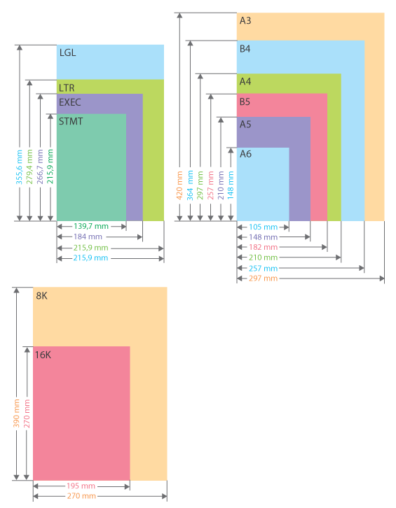 305 mm x 457 mm, A3, B4, A4, A4R, B5, B5R, A5R, 11" x 17", LGL, LTR, LTRR, STMTR, EXEC, 8K, 16KR, 16K ja Mukautettu koko (139,7 mm x 182 mm – 304,8 mm x 457,2 mm)