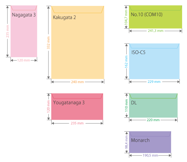 Seuraavassa taulukossa näytetään useimmat tässä laitteessa käytettävissä olevat paperi- ja kirjekuorikoot.