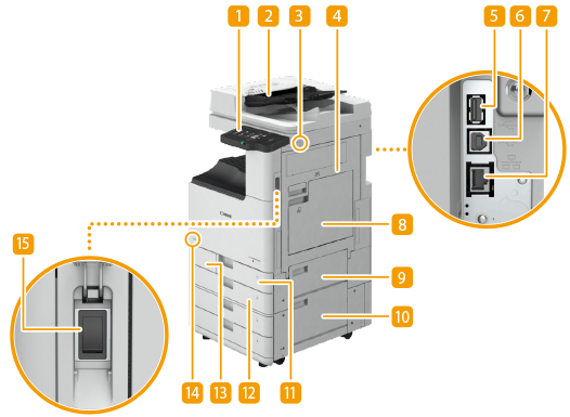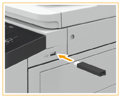 Voit liittää USB-muistivälineen laitteen oikealla puolella sijaitsevaan USB-porttiin ja tulostaa tietoja suoraan USB-muistivälineestä. Myös laitteella skannatut alkuperäiset asiakirjat voidaan tallentaa suoraan USB-muistivälineeseen.