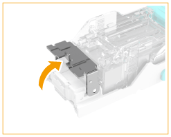 Avaa lukitus vetämällä niittikasetin vihreä uloke alas. Nosta kasettia kevyesti ylöspäin samalla, kun vedät sitä suoraan ulos.