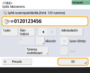 Faksien lähettäminen ulkomailleSyötä ulkomaan suuntanumero, maakoodi ja faksinumero, tässä järjestyksessä. Jos et voi muodostaa yhteyttä ulkomaiseen vastaanottajaan, lisää numeron ja seuraavan numeron väliin tauko valitsemalla <Tauko>.