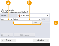 Faksien lähettäminen aliosoitteellaLaite tukee ITU-T*-standardin aliosoitteiden käyttöä. Jos vastaanottava faksilaite on yhteensopiva ITU-T aliosoitteiden kanssa, voit lähettää asiakirjoja paremmilla turvaominaisuuksilla liittämällä faksiliikennöinteihin aliosoitteen ja salasanan. Voit lähettää asiakirjan aliosoitteella kirjoittamalla faksinumeron, valitsemalla <Aliosoite> tai <Aseta tiedot> ja kirjoittamalla sitten aliosoitteen ja salasanan.