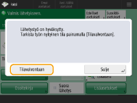 Kun <Näytä ilmoitus kun työ on hyväksytty> -asetuksena on <Kyllä>, <Tilavalvonta>-näyttö voidaan avata seuraavalla näytöllä, joka tulee esiin, kun lähetystyö vastaanotetaan. <Näytä ilmoitus kun työ on hyväksytty>
